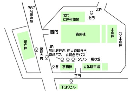 - ※大田市場内には「北門」「水産棟」「事務棟」と3箇所のバス停があります。位置は市場内案内地図でご確認ください。